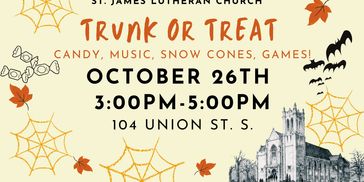 St. James' annual Trunk or Treat event is Sunday, Oct. 26 at 3:00pm and we are looking volunteers!